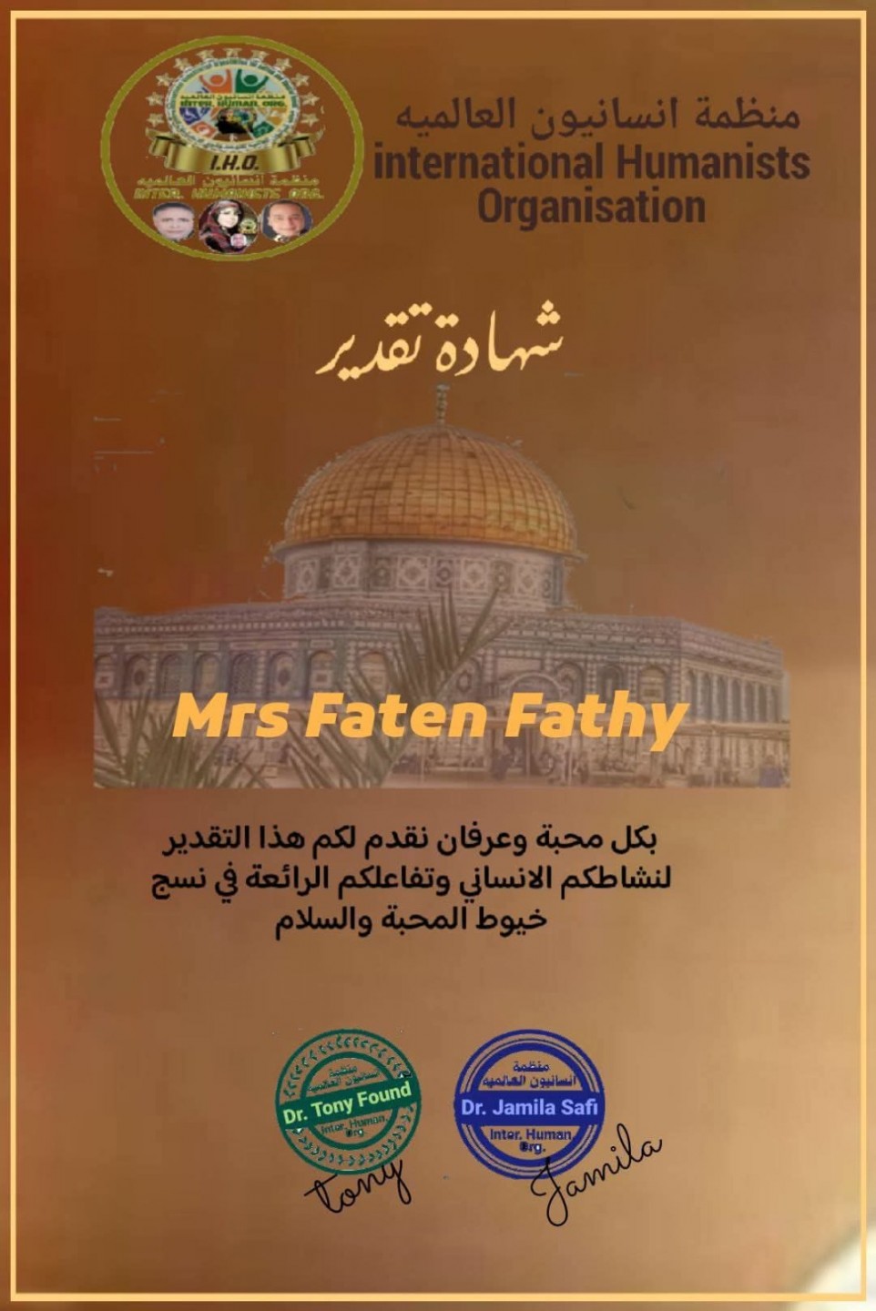 جاء في نص كلمة مدير المنظمة وشهادة التكريم: "بكل محبة وعرفان نقدم لكم هذا التقدير لنشاطكم الإنساني وتفاعلكم الرائع في نسج خيوط المحبة والسلام."