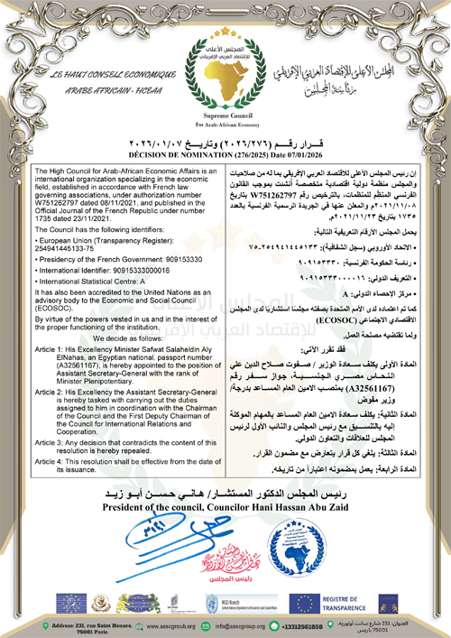 يُذكر أن المجلس الأعلى للاقتصاد العربي الإفريقي منظمة دولية عالمية أنشئت وفقًا لقواعد القانون الدولي وقانون المنظمات الفرنسي، ولها كافة الامتيازات والحصانات الدولية والدبلوماسية التي يمنحها القانون الدولي، ويتمتع بكافة الامتيازات والحصانات كافة العاملين بها وكافة المقرات وممتلكات المجلس، والمجلس هو منظمة دولية تعمل كمجلس استشاري للأمم المتحدة ومسجلة لدى المجلس الاقتصادي الاجتماعي بالأمم المتحدة، ومُعتمد لدى الأمم كمنظمة أممية عاملة في نطاق منظمة الأمم المتحدة وفق قواعد القانون الدولي.
